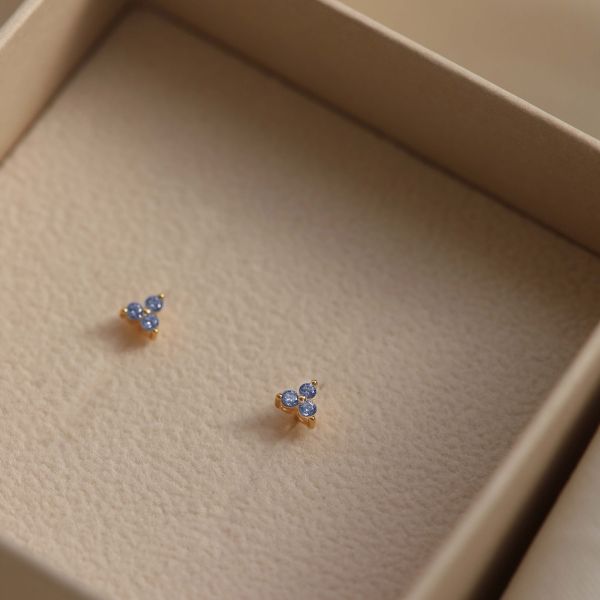 Dit zijn onze Karma Zirconia Triple Flower Jeans Blue Earstuds. De oorbellen zijn verkrijgbaar in 925 sterling zilver of met een 14K gouden plating. Alle oorbellen worden per paar verkocht.