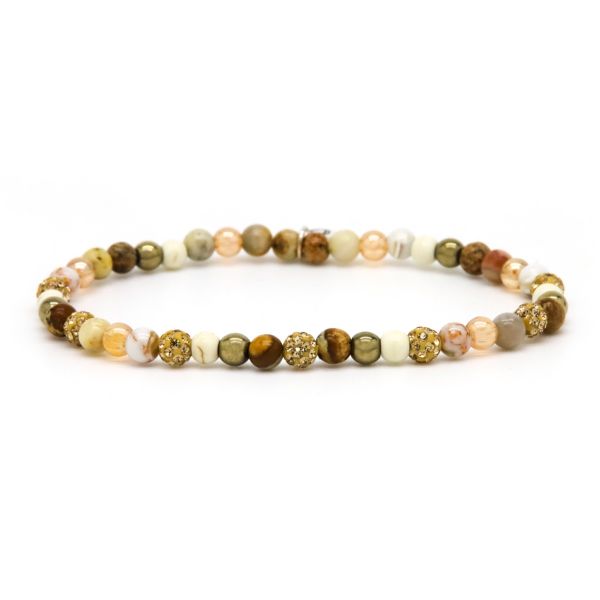 Onze armbandjes zijn gemaakt van echte natuurstenen met kristal kralen. Om de sieraden zo lang mogelijk mooi en glanzend te houden adviseren wij voorzichtig te zijn met water, parfum en andere chemicaliën.