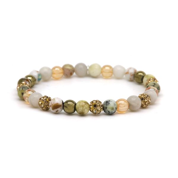 Onze armbandjes zijn gemaakt van echte natuurstenen met kristal kralen. Om de sieraden zo lang mogelijk mooi en glanzend te houden adviseren wij voorzichtig te zijn met water, parfum en andere chemicaliën.