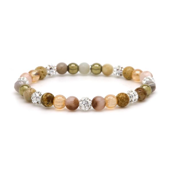 Onze armbandjes zijn gemaakt van echte natuurstenen met kristal kralen. Om de sieraden zo lang mogelijk mooi en glanzend te houden adviseren wij voorzichtig te zijn met water, parfum en andere chemicaliën.