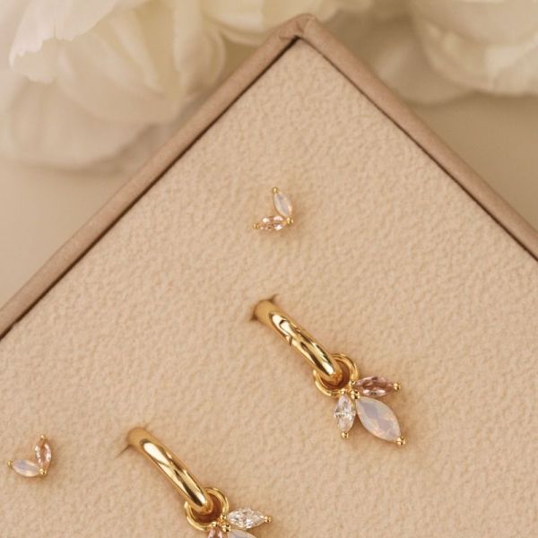 Dit zijn onze Tiny Double Leaves Opal White-Salmon Oorstekers. De oorbellen zijn verkrijgbaar in 925 sterling zilver of met een 14K gouden plating. Alle oorbellen worden per paar verkocht.